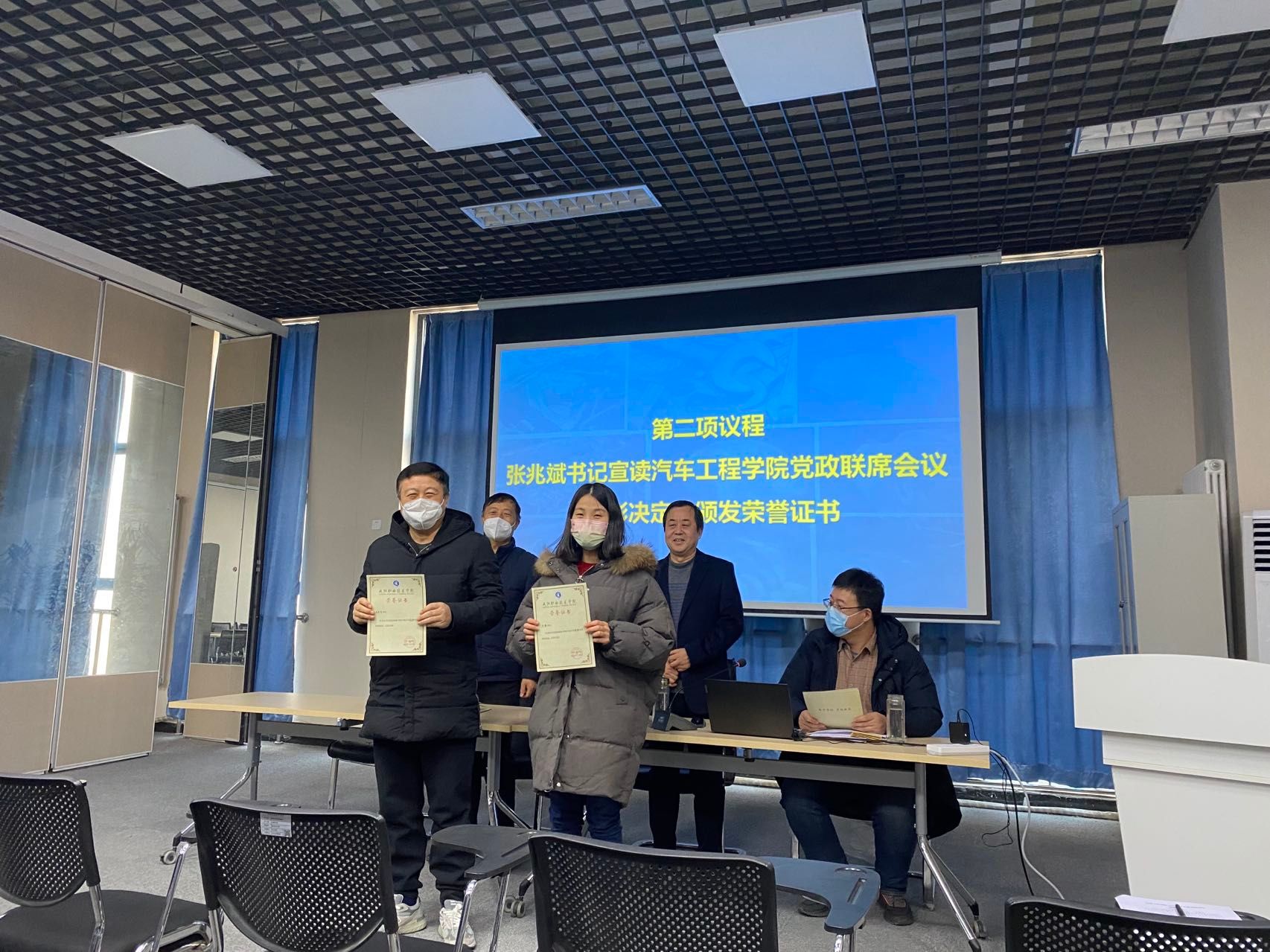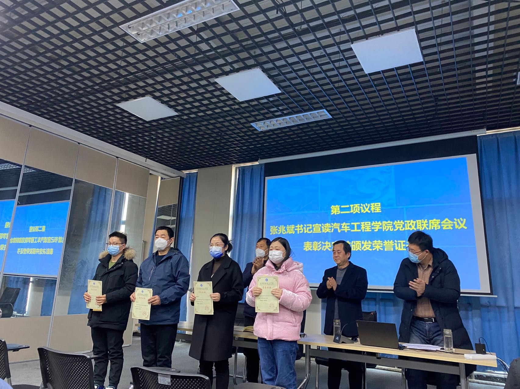 第二项议程由张兆斌书记宣读gg999策略手机白菜2023年度表彰决定并颁发荣誉证书。新能源汽车技术教研室主任习璐、员工发展办公室主任云争飞两位教师被评为2022年质量绩效考核“优秀等次”,杨晶晶、陶振华、朱智、任小婕四位教师被评为2022年度“先进工作者”。