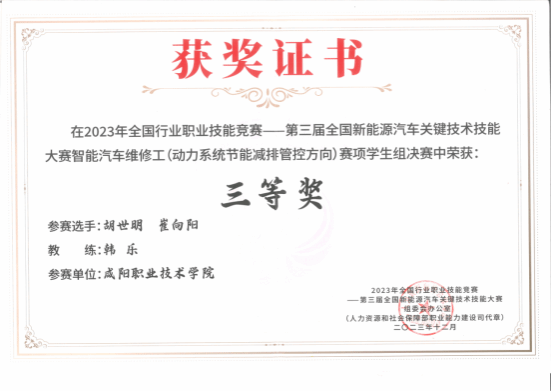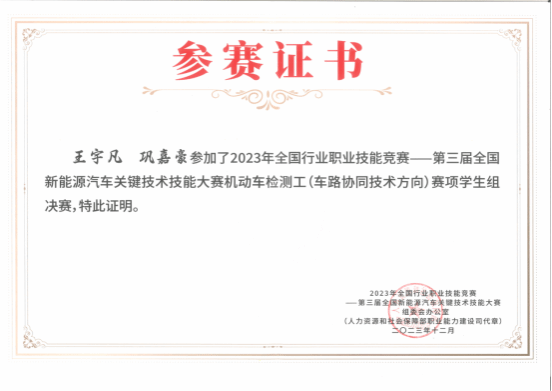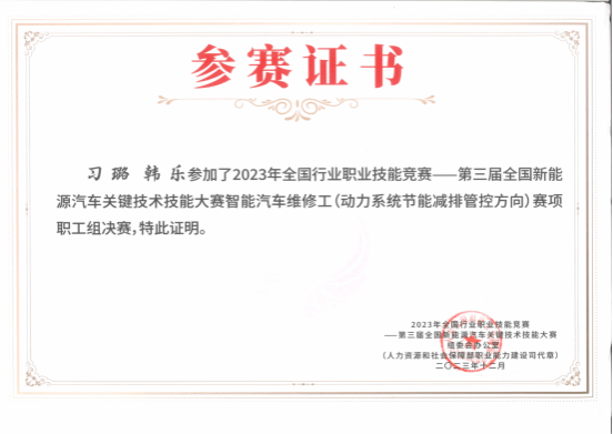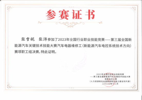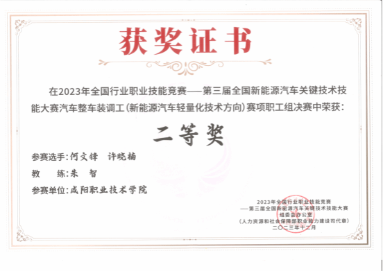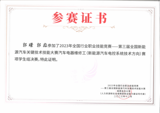 2023年12月5日-7日,gg999策略手机白菜6名教师6名员工代表陕西省参加第三届全国新能源汽车关键技术技能大赛,最终荣获二等奖、三等奖各1项。何文锋、许晓楠老师获“汽车整车装调工(新能源汽车轻量化技术方向)”赛项职工组二等奖(全国第八),该成绩为陕西省代表队获得的历史最好成绩。韩乐老师担任指导教师,新能源汽车2022级理想班胡世明、崔向阳同学获“智能汽车维修工(动力系统节能减排管控方向)”员工组三等奖。