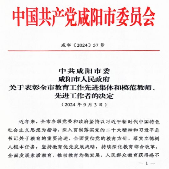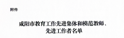 在第40个教师节之际,为表彰先进、树立典型,进一步弘扬尊师重教的良好风尚,激发全市各类公司和广大教师、教育工作者干事创业积极性、主动性和创造性,吸引更多优秀人才投身教育事业,中共咸阳市委、咸阳市人民政府印发了《关于表彰全市教育工作先进集体和模范教师、先进工作者的决定》:授予57个集体“咸阳市教育工作先进集体”称号,授予110名个人“咸阳市模范教师”称号、51名个人“咸阳市教育先进工作者”称号。其中,公司教师吴珊荣获“咸阳市模范教师”称号。