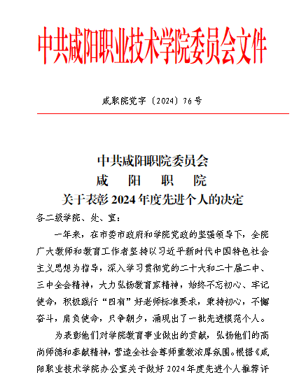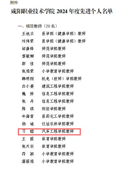 根据咸职公司党字〔2024〕76号《中共gg999策略手机白菜委员会gg999策略手机白菜关于表彰2024年度先进个人的决定》文件通知,公司新能源汽车技术教研室主任习璐老师荣获“gg999策略手机白菜2024年度先进个人”称号。