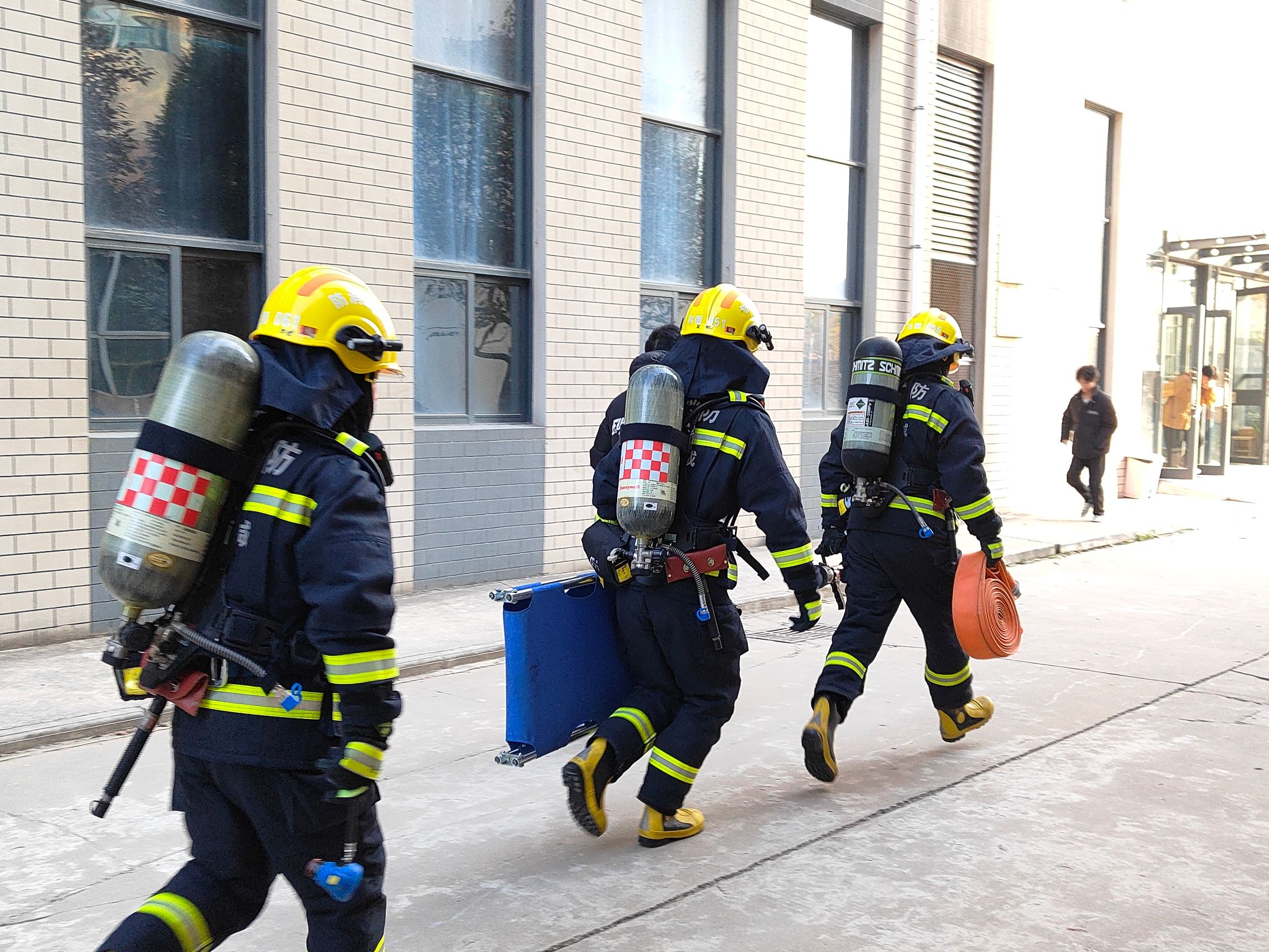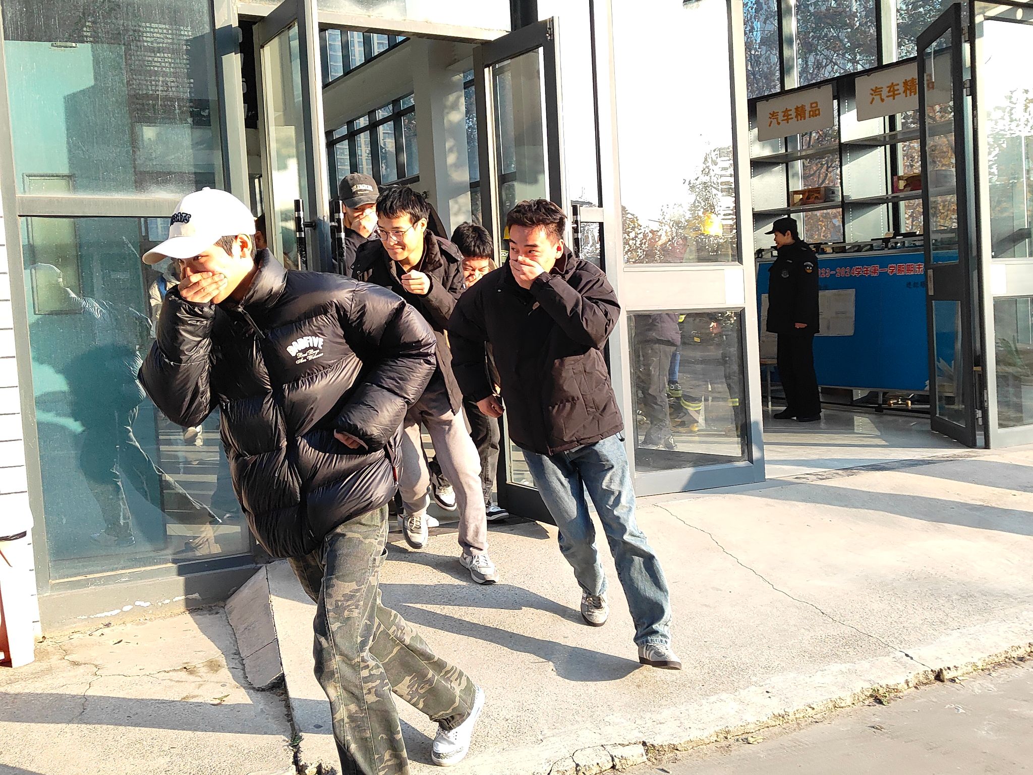 “快!捂住口鼻、低头弯腰,注意脚下、快速离开”回响在每个楼道间、楼梯口和一楼大厅和各个应急安全出口。