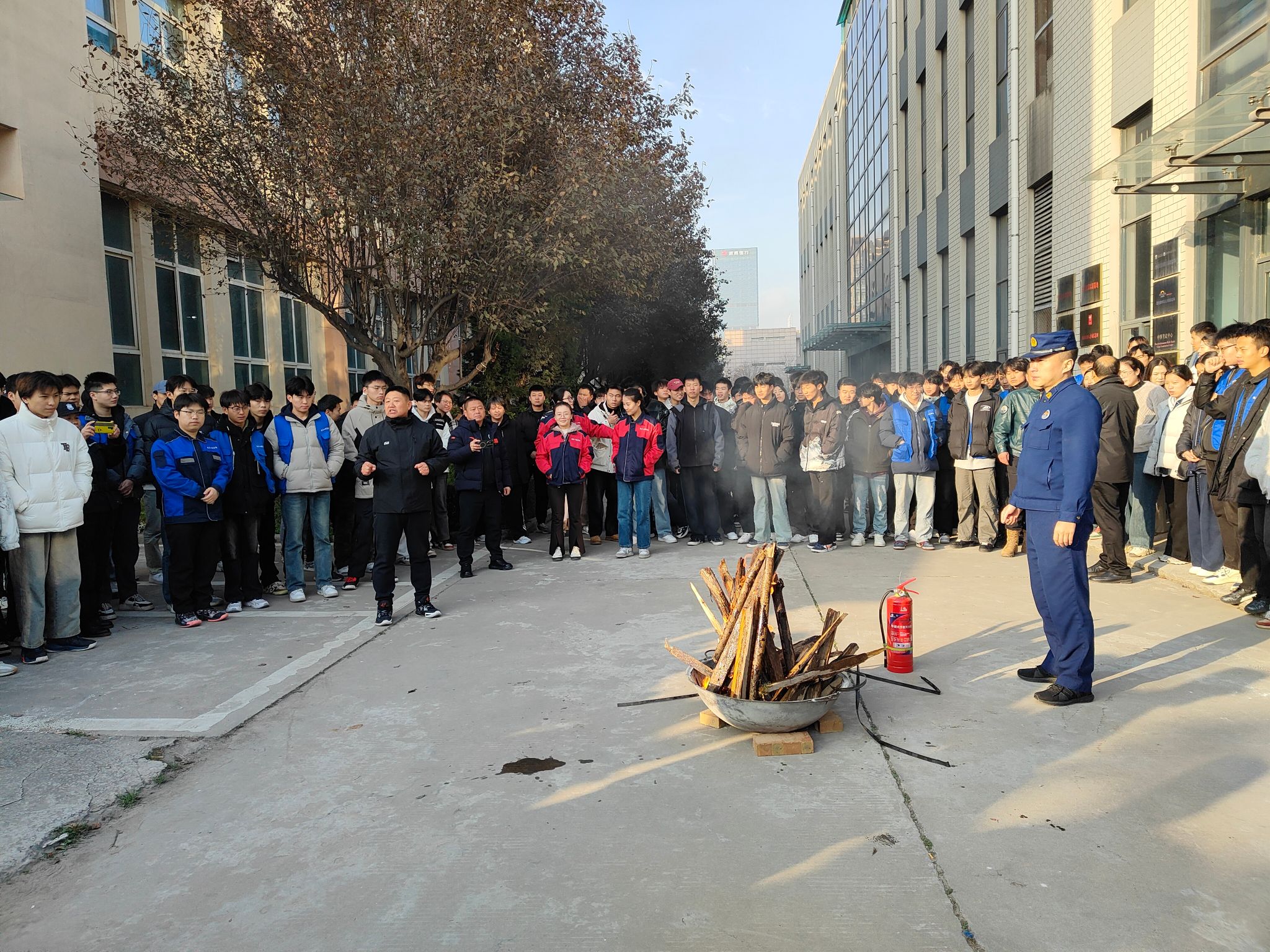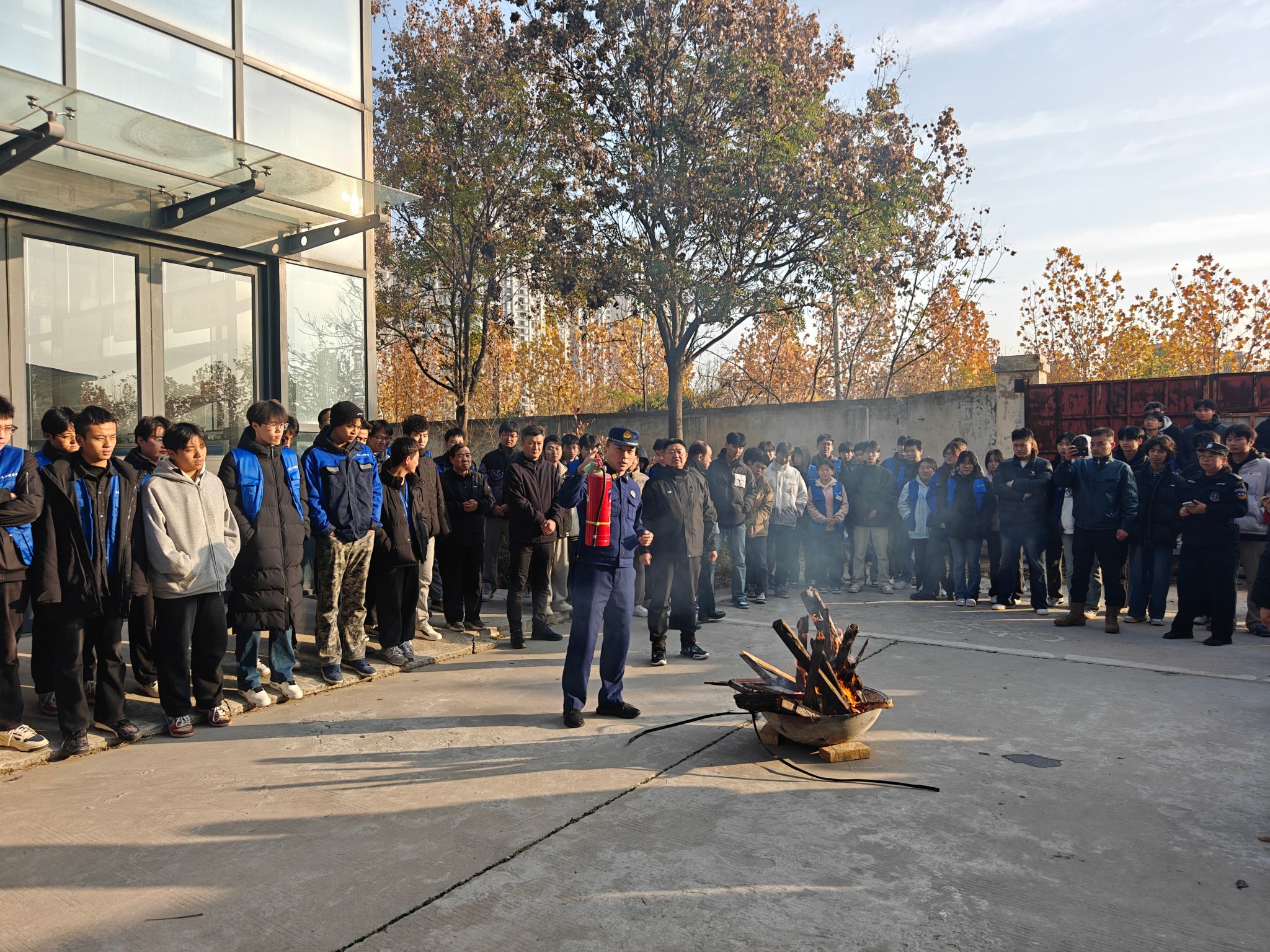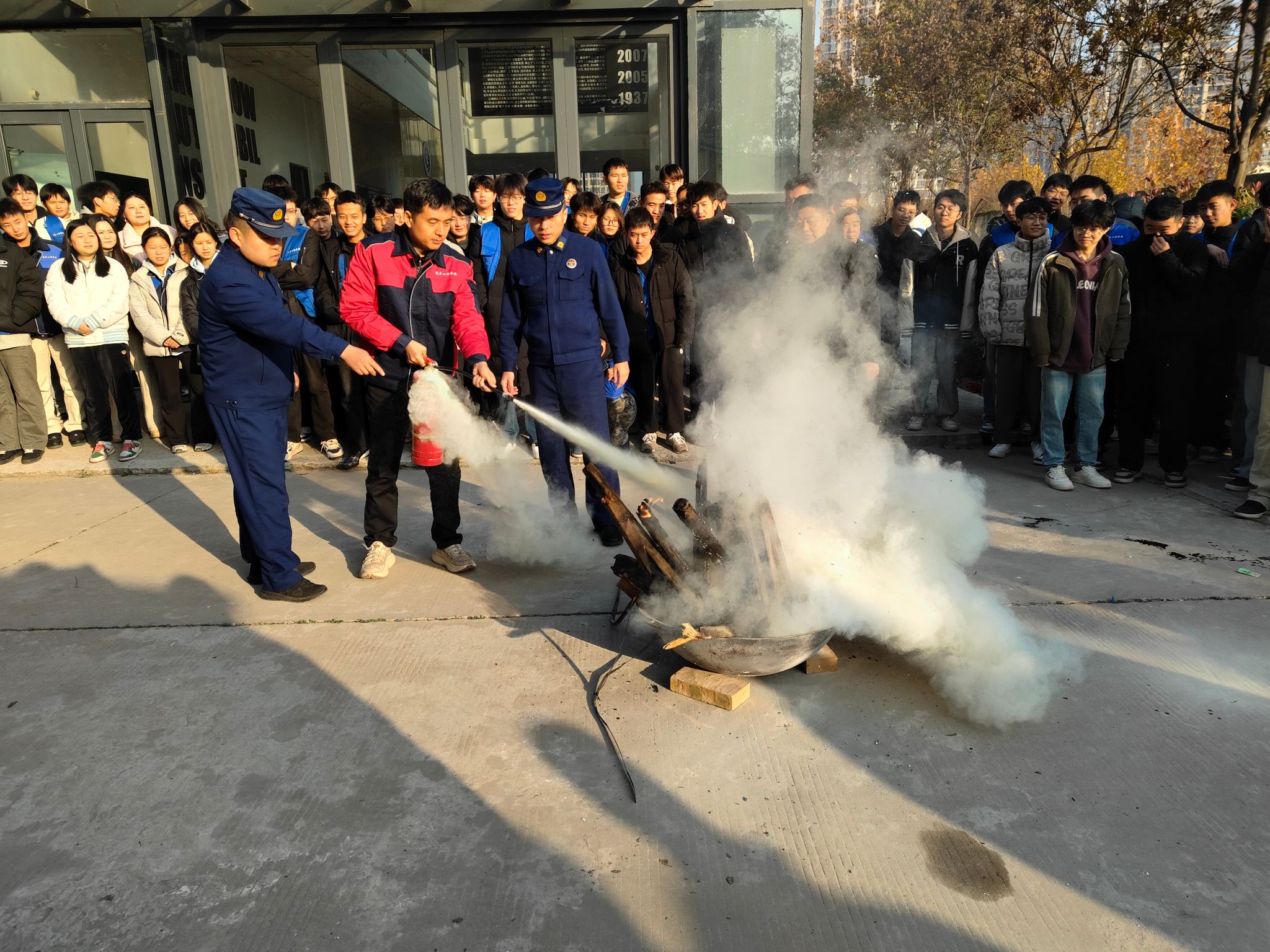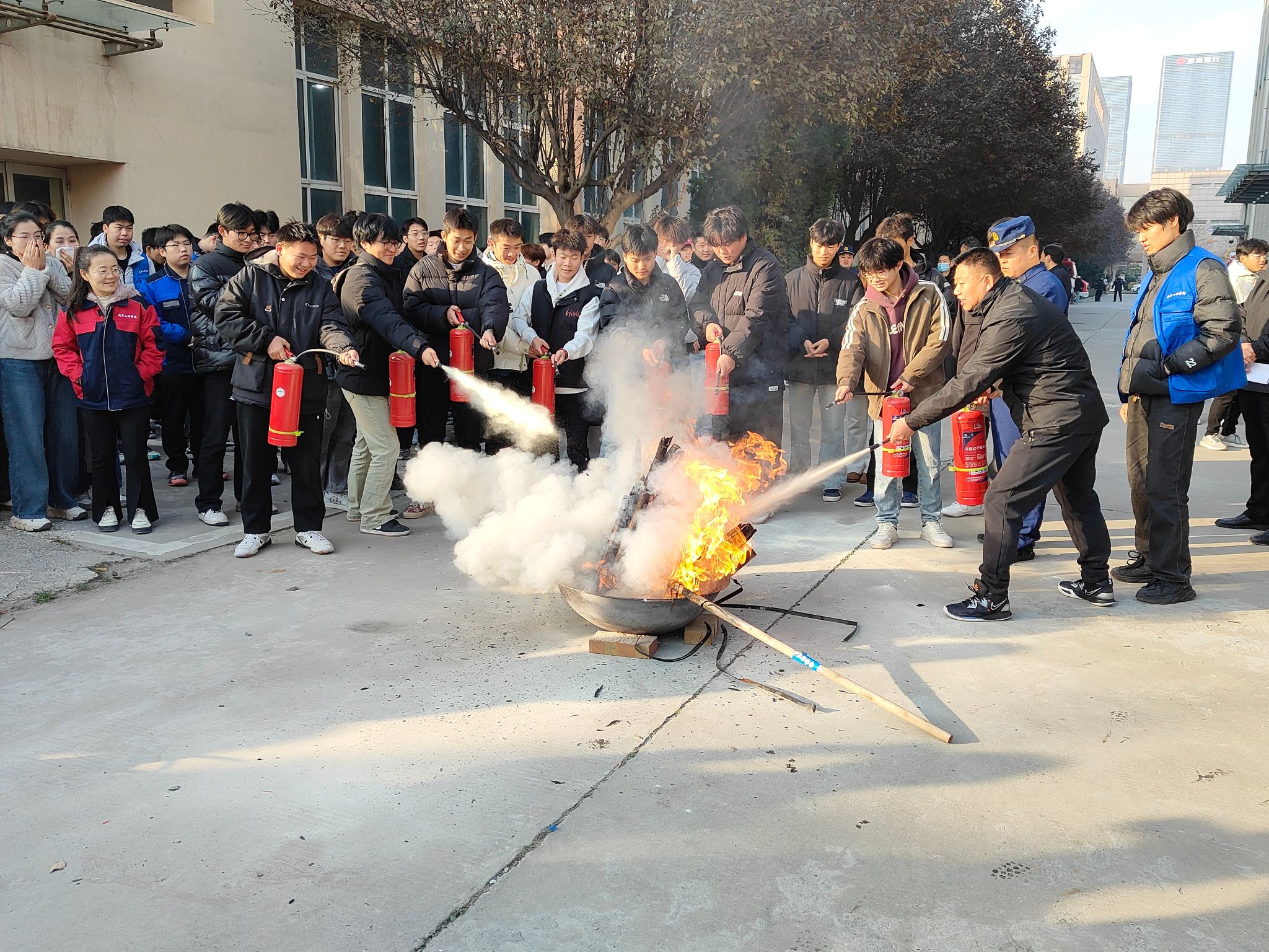 沣西消防大队白云少站长现场讲解、演示了干粉灭火器的使用方法和注意事项,重点强调了“一提二摇三拔四握五压”使用技巧,指导全体教师和员工义务消防员对危险“火源”进行了现场灭除体验。