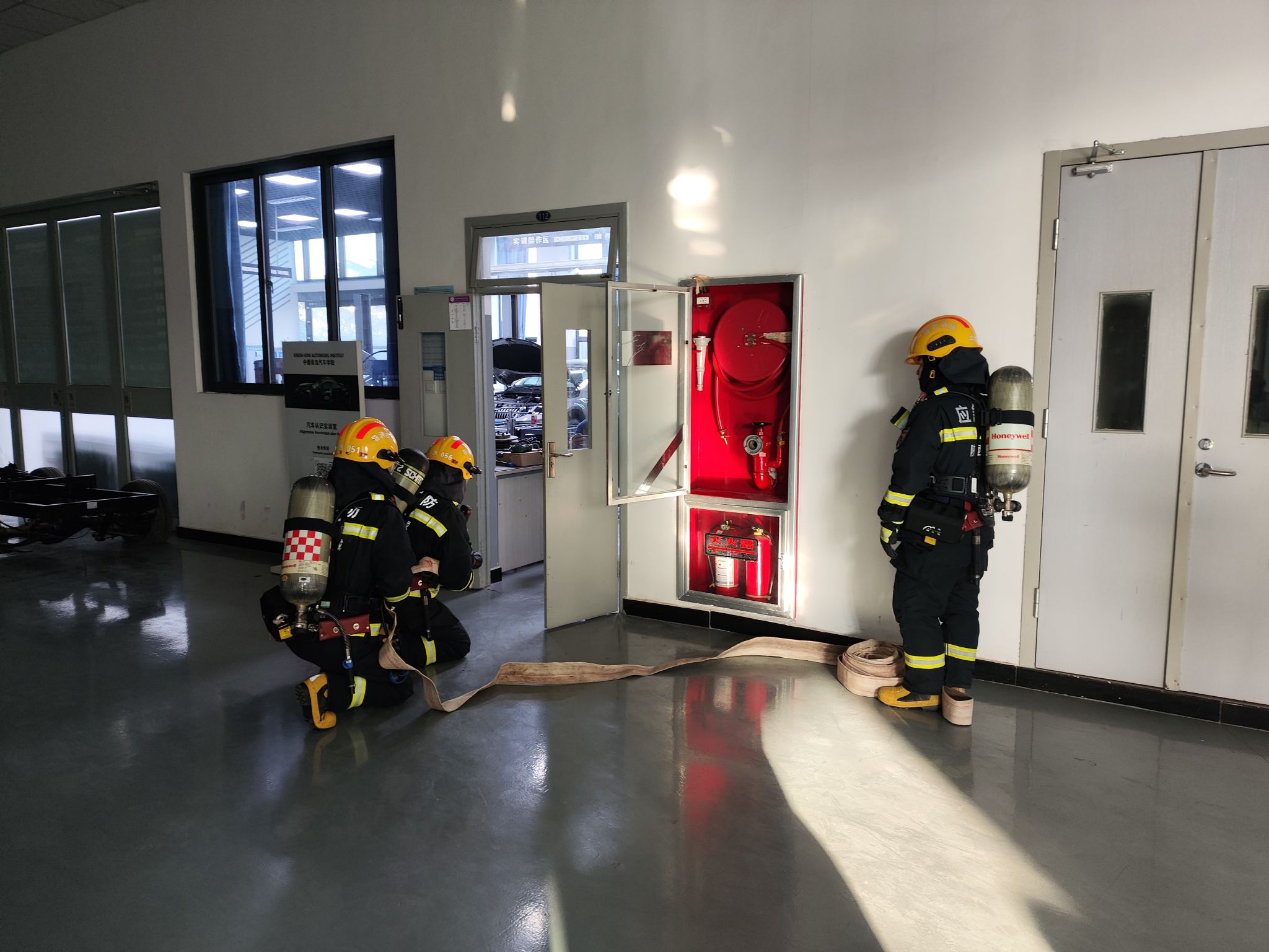 消防人员赶到后,全方位排查整个楼宇人员撤离及疏散情况,逐个房间排查遗留“火源”及其他安全隐患,检查所有消防器材、门窗电源及实训设备。