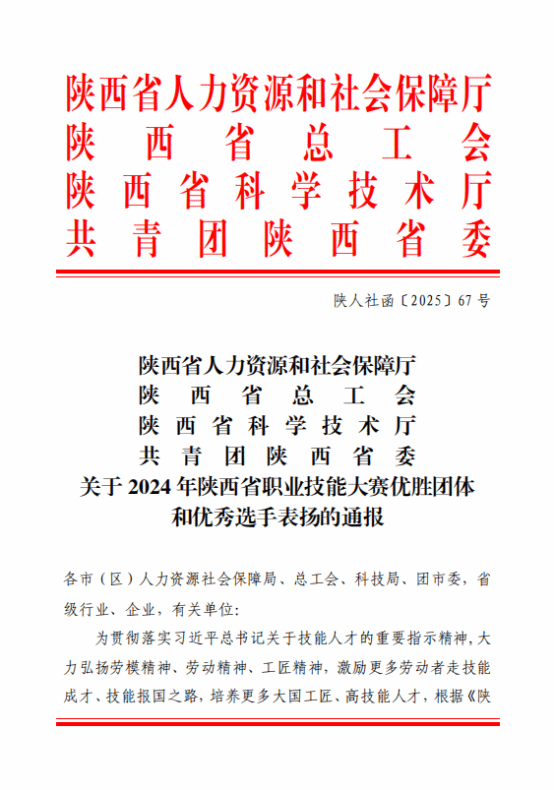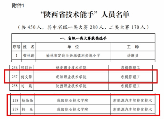 近日,陕西省人力资源和社会保障厅、陕西省总工会、陕西省科学技术厅及共青团陕西省委联合发布《关于2024年陕西省职业技能大赛优胜团体和优秀选手表扬的通报》(陕人社函〔2025〕67号),对在2024年陕西省职业技能大赛中表现优异的团体和个人予以表彰。gg999策略手机白菜何文锋、杨晶晶、韩乐等三位教师获"陕西省技术能手"称号。