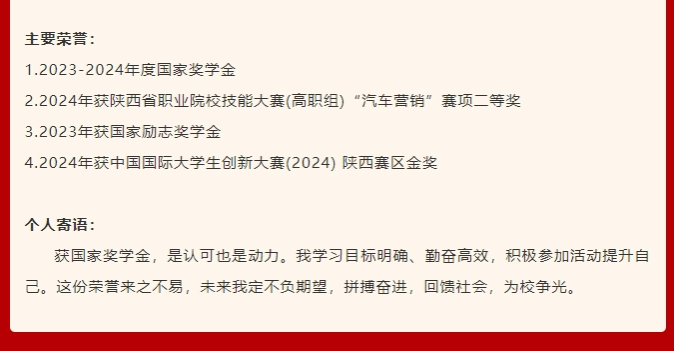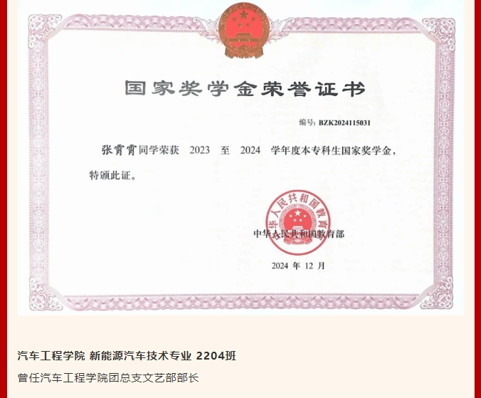 近期,2023-2024学年度本专科生国家奖学金获奖证书下发,其中公司新能源汽车技术专业张霄霄同学获教育部表彰。