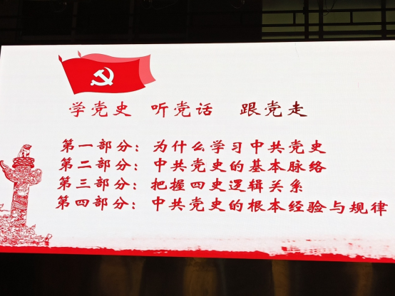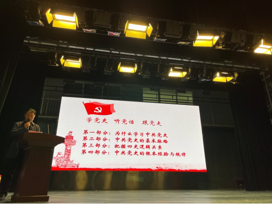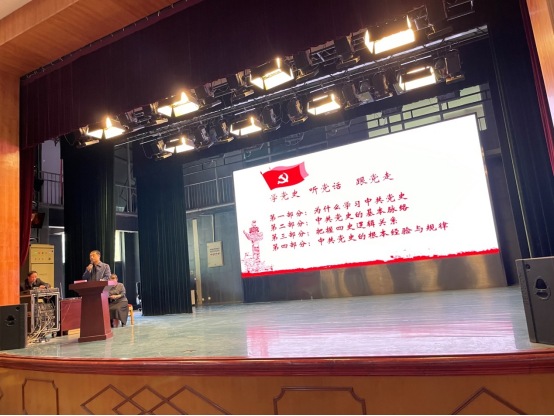 接着,循着百年党史脉络,王经理激情饱满地用一桩桩一件件的史实故事淋漓尽致地展现了我党百年来艰苦卓绝、浴血牺牲的拼博过程和艰苦朴素、自力更生的奋斗过程。从新民主主义革命到社会主义革命和建设,从改革开放和社会主义现代化建设到中国特色社会主义新时代,旁征博引、徐徐道来,让全体师生深刻感受到了党的百年历程:开天辟地、改天换地、翻天覆地、惊天动地。大家不由从内心产生了十分强烈的民族自豪感与爱国爱党的责任感!