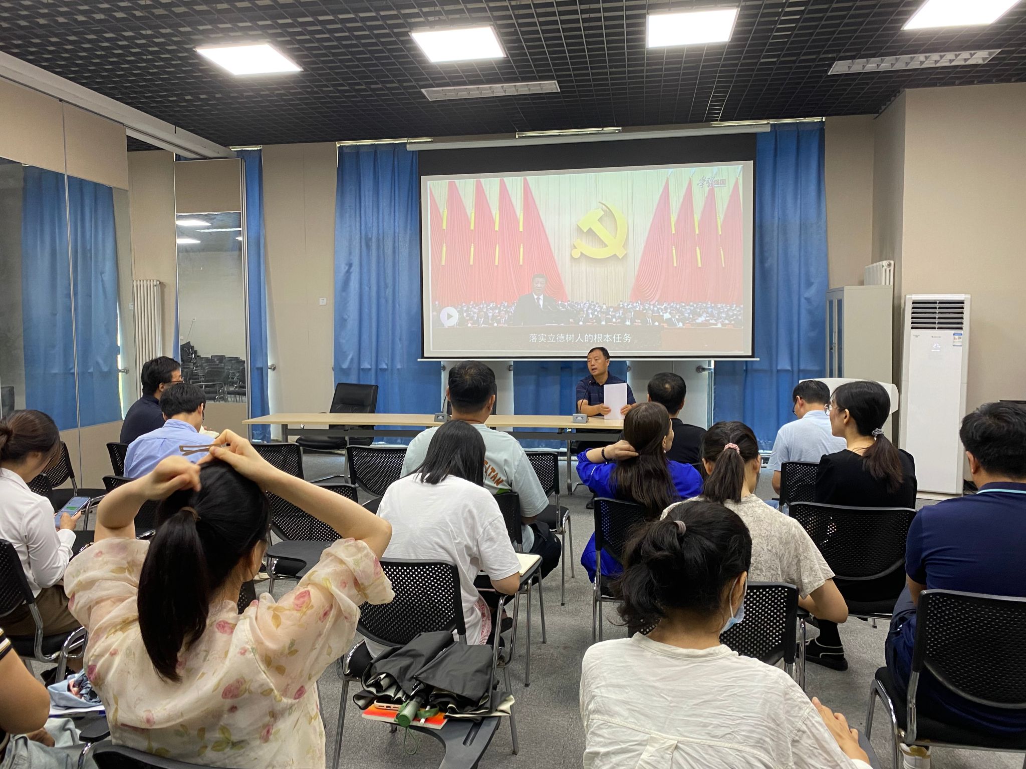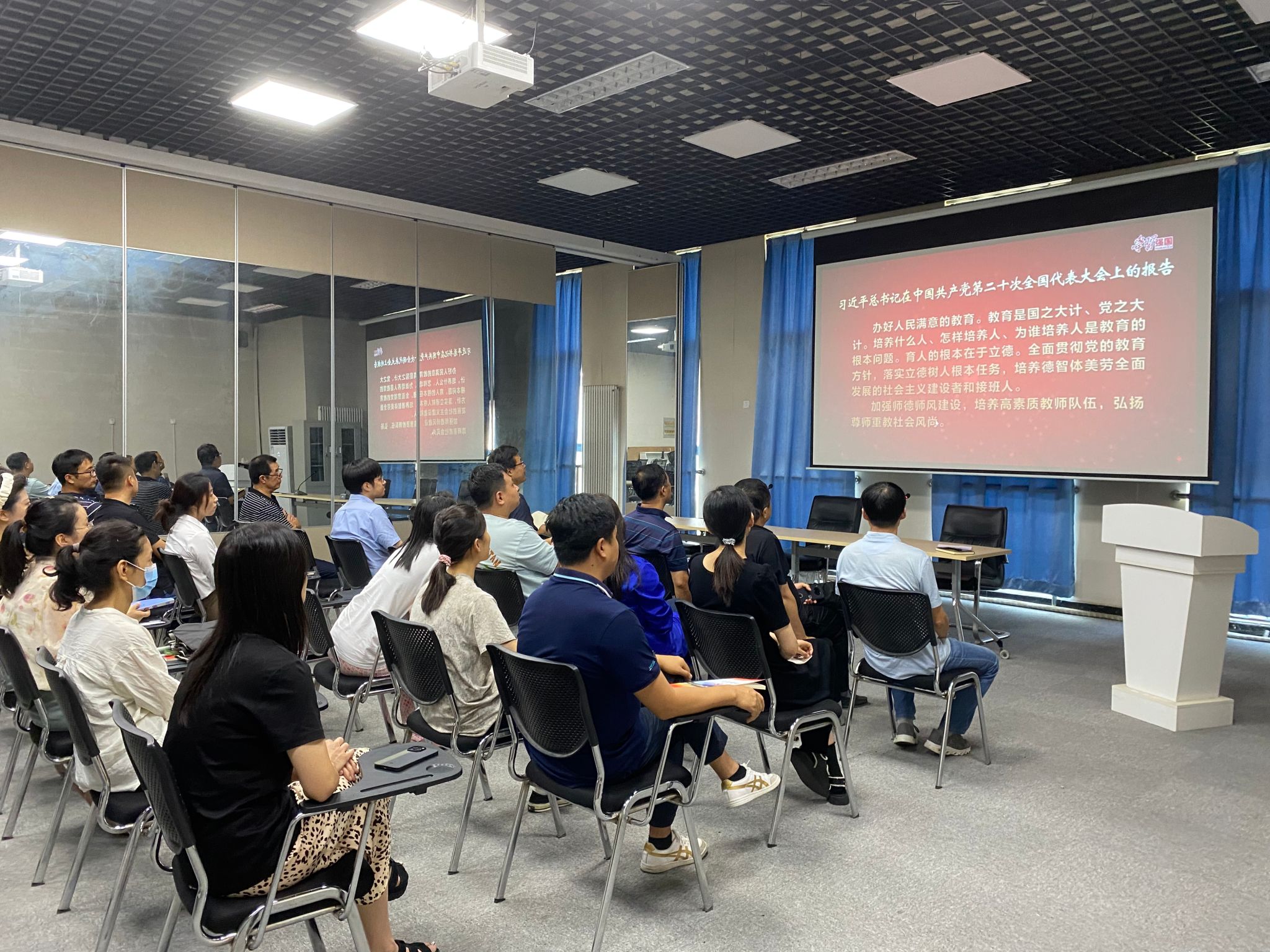 9月14日下午,公司党总支组织全体无课教职工在教学楼(4)312多功能厅集体观看专题片《习近平的教师情》,并开展思想政治理论集中学习。
