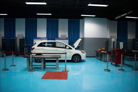 新能源汽车综合实训室概况:实训室内现有北汽新能源EV160实训车1辆、北汽新能源EU260实训车一辆。新能源汽车综合故障诊断仪2台,汽车用数字示波器2台,纯电动汽车能量回收系统示教板2个,纯电动汽车电池管理系统示教板1个,纯电动汽车电池性能检测示教板2个,纯电动汽车整车故障检测示教板2个,永磁同步电机实训台架2台,交流充电桩2台,直流充电桩1台,广告机6台,纯电动汽车整车故障检测配套的工具车、零件车、零部件陈列架、气源、多媒体教学系统等设备仪器,可以实现纯电动汽车认识、纯电动汽车高压安全防护等理实一体化教学。