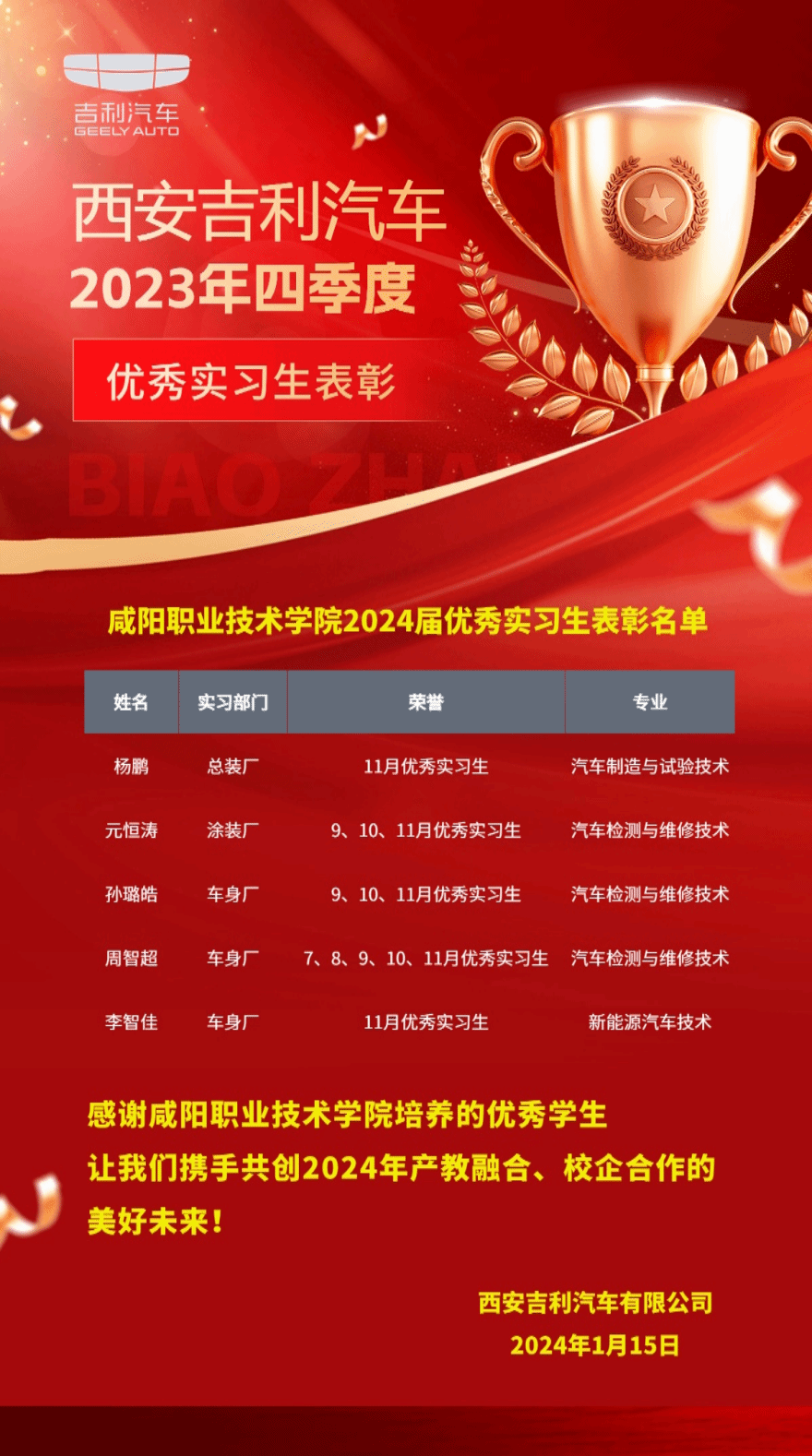 公司杨鹏等五名员工自入职西安吉利汽车有限公司以来,表现突出,受到了企业的高度肯定,获得了西安吉利汽车有限公司2023年第四季度优秀实习生表彰。西安吉利汽车有限公司特向公司发来贺信并深表感谢!