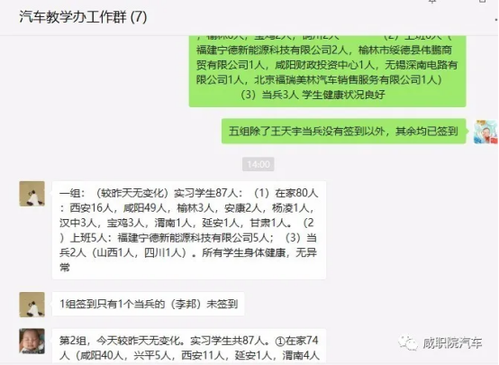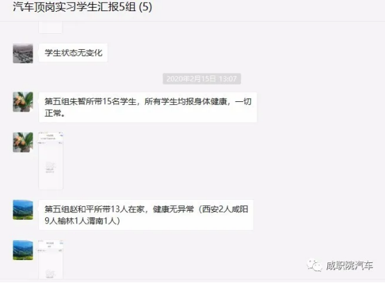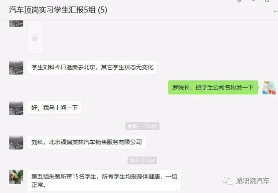 任务分配后,罗联合经理及张兆斌书记深入一线,亲自承担指导联系顶岗实习员工任务,在领导的带领下汽车公司全体指导教师迅速开展调查统计工作,按照统一部署,每天了解员工情况,逐个落实,通过微信、短信、电话等方式确保掌握每一个员工的工作、生活情况,了解其身体健康状况,指导员工完成适当实践作业。