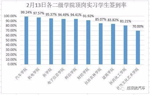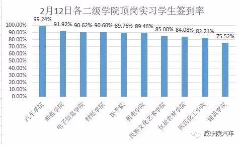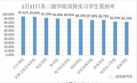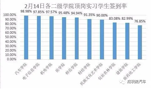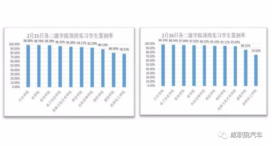 在每位实习指导老师和员工们不懈的努力和坚持之下,汽车公司疫情防控切期间做到了顶岗实习员工除当兵员工外99%的签到率,签到率连续一周保持全职院第一。