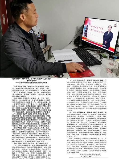 没有生而英勇,只是选择无畏,白衣战士,一路走好。在看完张建华同志先进事迹线上报告后,汽车公司全体师生被他在疫情防控工作一线的敬业精神深深感动,纷纷表示在以后的工作学习中,要以张建华同志为楷模,为社会多做贡献。