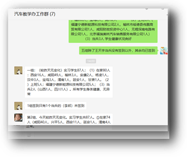 任务分配后,罗联合经理及张兆斌书记深入一线,亲自承担指导联系顶岗实习员工任务,在领导的带领下汽车公司全体指导教师迅速开展调查统计工作,按照统一部署,每天了解员工情况,逐个落实,通过微信、短信、电话等方式确保掌握每一个员工的工作、生活情况,了解其身体健康状况,指导员工完成适当实践作业。