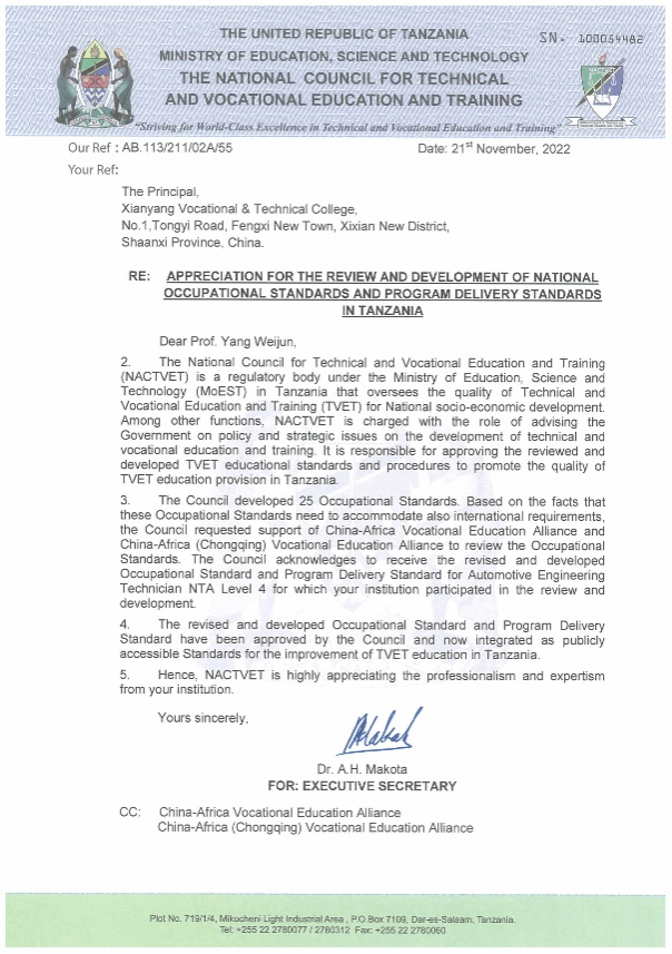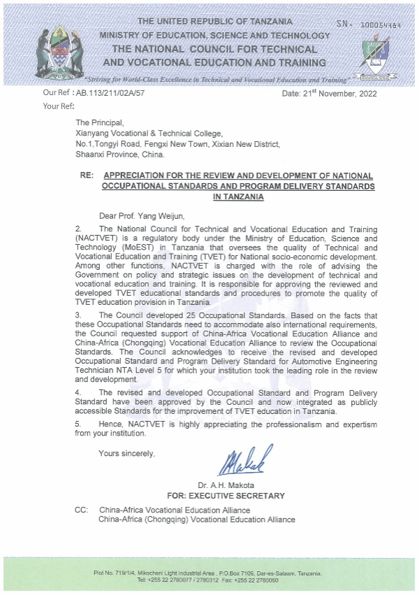 在坦桑尼亚国家职业教育委员会、中非职业教育联盟的组织下,共有43所中国职业院校参与坦桑尼亚国家职业标准开发项目,制定54个岗位职业标准和配套专业教学标准。该项目是中国首次大规模、整装批量式直接为一个非洲国家开发和修订职业标准,对我国职业教育国际化发展具有里程碑意义。该项目启动以来,受到了央视新闻、搜狐网、新浪新闻、网易新闻、中华网、现代高等职业技术教育网等各大网络媒体的广泛关注,新华社达累斯萨拉姆分社对此进行了专题报道。