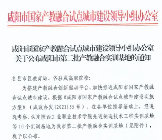 为搭建产教融合创新驱动平台,加快推进咸阳市国家产教融合试点城市建设,11月22日,咸阳市国家产教融合试点城市建设领导小组办公室印发《关于公布咸阳市第二批产教融合实训基地的通知》,认定10个实训基地为咸阳市第二批产教融合实训基地。公司“汽车检测与维修公共实训基地”成功入选。